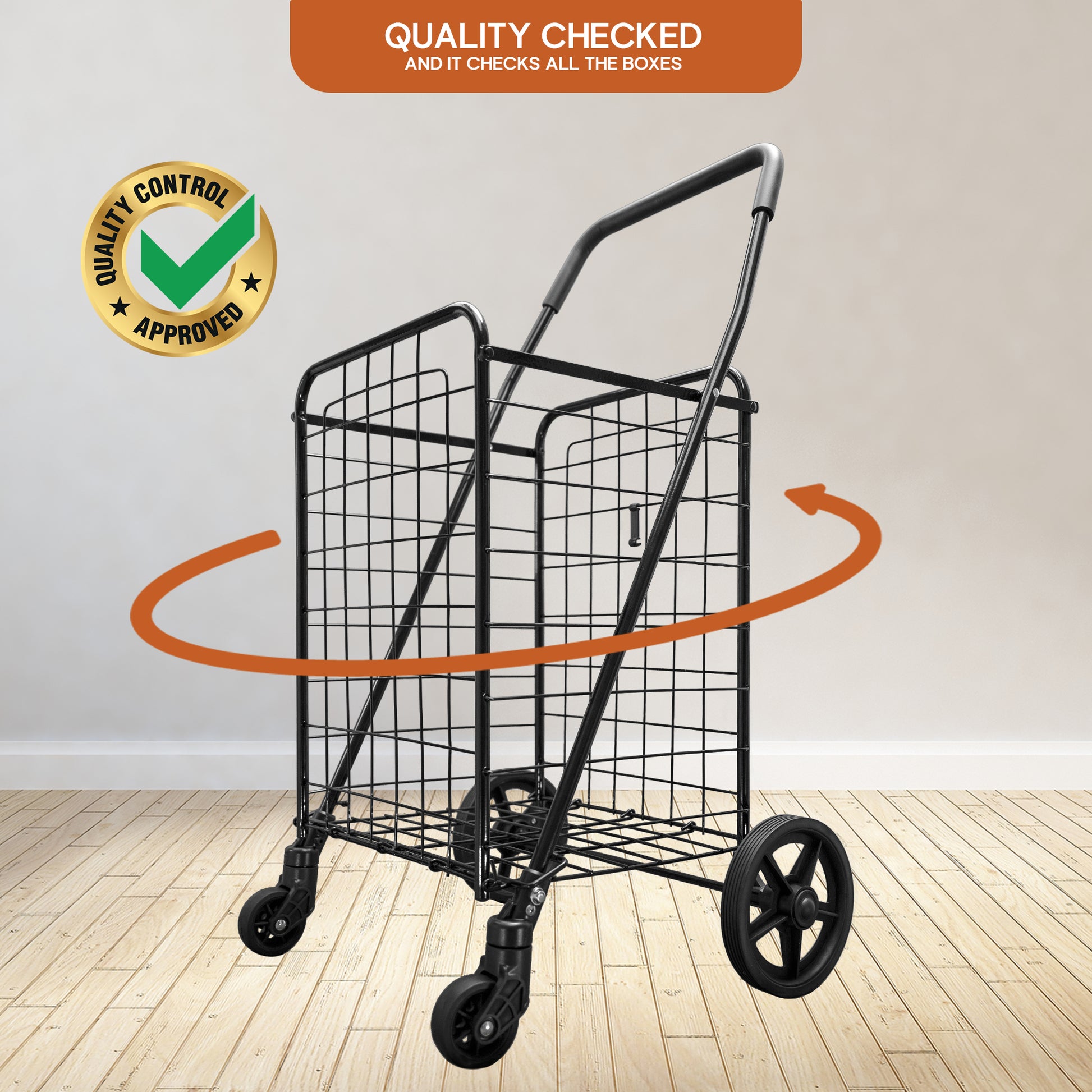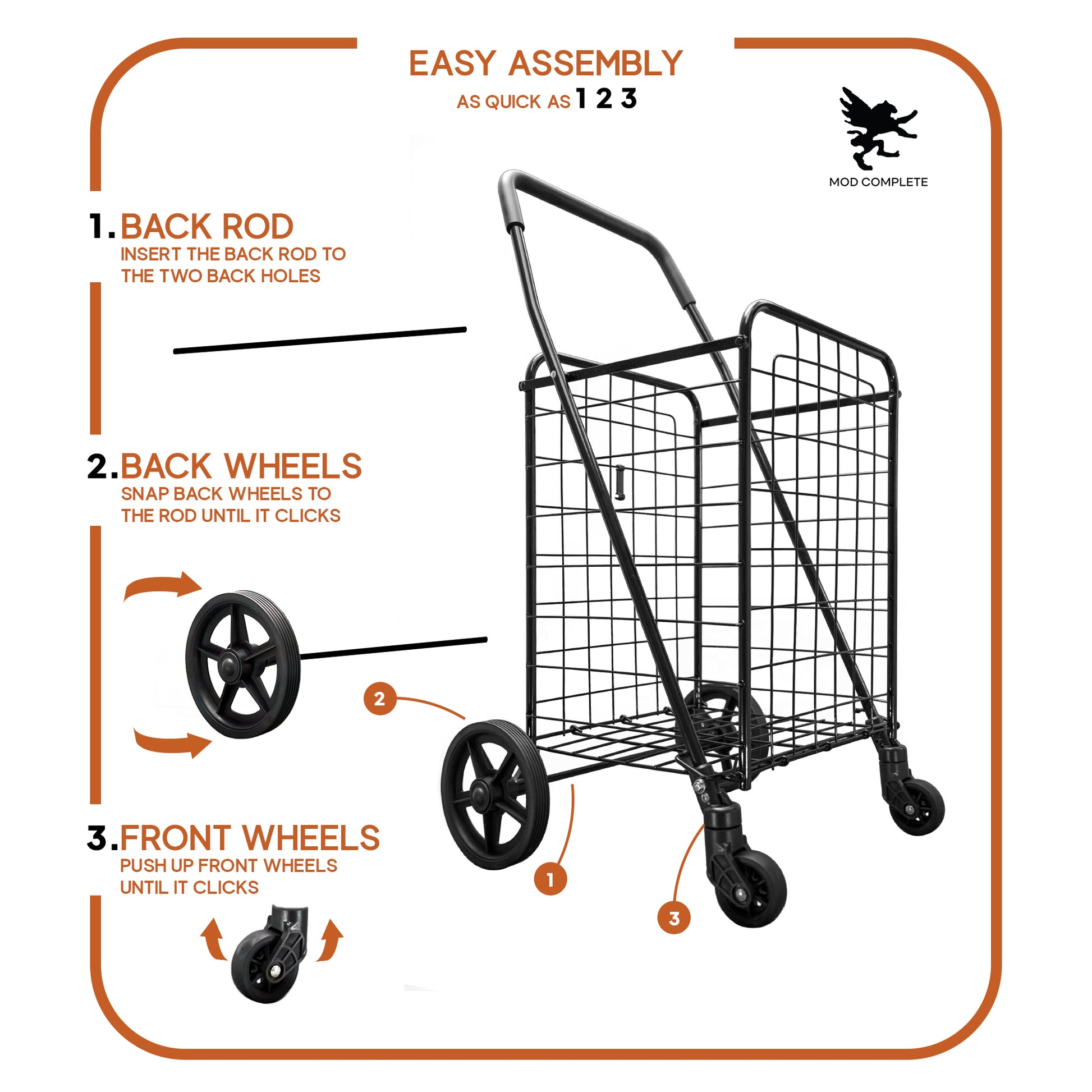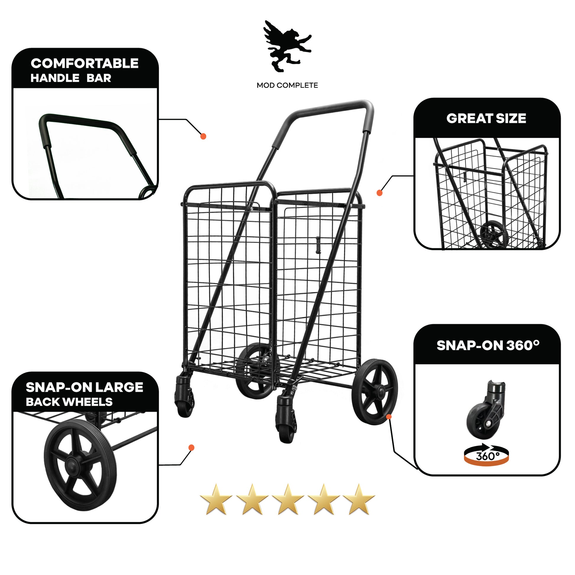 - SMOOTH NAVIGATION - Meet our MOD Complete shopping cart, where effortless maneuvering is the name of the game. Engineered with precision, it features 360-degree, 3” swivel wheels up front and 7” snap-on wheels at the back. Effortlessly attach or detach the back wheels for swift use or convenient storage – bid farewell to the challenges posed by outdated, cumbersome carts!